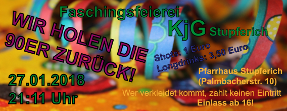 Die KjG Stupferich veranstaltet jedes Jahr eine Faschingsparty für jung und alt. Bei Getränken, Musik und den besten Kostümen darf hier jeder ab 16 Jahren die Nacht zum Tag machen.